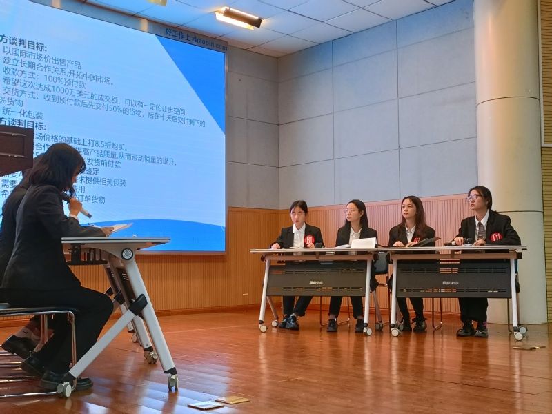 在职场面对面环节中,选手们经赛前抽签分为两组,各模拟代表甲乙两方进行商务谈判。首先,双方按顺序上台展示本方商业谈判书内容和谈判目标。展示结束后,双方进入自由谈判交锋环节,分别对本方的商业优势、谈判诉求做出阐述并与对方进行了合理化、规范化的商业谈判。在此过程中,双方选手沉着冷静、逻辑严密、你来我往,不断强调己方诉求与底线并合理友好地反驳对方诉求,努力争取本方利益最大化,呈现出一场精彩的谈判。最终一锤定音,双方各派出一名代表陈述谈判结果。嘉宾评委针对策划书内容展示、谈判内容及选手表现进行了提问或点评,选手们给出针对性回答。