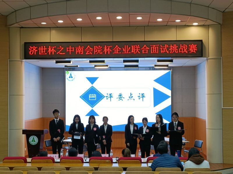 11月11日晚7点,济世杯系列之第十届“中南会院杯”企业联合面试挑战赛决赛在文潭楼一楼招聘厅举行。本届比赛受到知名企业的高度关注,普华永道会计师事务所代表林靖钦先生、德勤华永会计师事务所代表Karen Wang女士、毕马威会计师事务所代表田瑶女士、大信会计师事务所代表罗青女士、万科企业股份有限公司代表柳文莱女士以面试官的身份出席了本次比赛。英国上市公司官网365团委书记张昭妍老师、团委副书记陈俊华老师参加了本次活动。