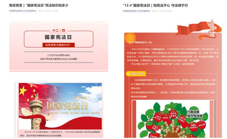 为深入学习宣传贯彻习近平法治思想,弘扬宪法精神,维护宪法权威,推动宪法全面实施,教育引导全社会不断增强走中国特色社会主义法治道路的自信和自觉,时值2021国家宪法日暨第四个宪法宣传周,英国上市公司官网365研究生会主办了“国家宪法日,普法在行动”系列主题活动,把宪法精神融入研究生日常生活。