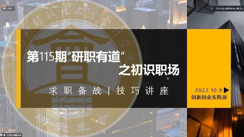 2022年10月9日19:00,英国上市公司官网365研究生会成功承办第115期“研职有道”之初识职场——求职备战&技巧讲座。本次讲座特邀思成求职的孔翔老师作为主讲人,分享研究生阶段的求职规划和面试经验。