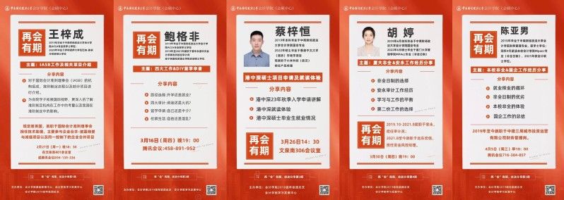 在活动中,王梓成分享了毕业后前往英国留学并就职于英国国际会计准则理事会(ISAB)的经历,通过具体的工作案例帮助同学们深入了解准则制定机构在工作中的考量以及我国在规则制定中的影响;鲍格非围绕“四大工作”和“留学申请”两主题进行主题分享,以四大工作经历为切入点分析“先工作再留学”的道路选择,为同学们未来职业发展提供参考;蔡梓恒则具体介绍了香港中文大学(深圳)硕士项目的申请,并分享了就读体验、实习和就业情况,提高部分同学对该项目未来发展的信心;胡婷分享了在厦大MPAcc(非全日制)学习及厦门安永审计工作的经历,并通过分享工作后读研的心路历程鼓励同学们做好第二份职业选择;陈亚男则基于本校非全经历分析了非全的优劣和国企工作感受,并建议已经找到工作、暂未找到但是职业规划明确同学考虑就读非全,在就业择业的循环保持主动。在每期的交流环节,同学们就“如何进行职业选择”、“如何平衡工作和学习”、“在职申请出国规划”、“如何做选择的减法”等问题向师兄师姐们提问,5位嘉宾进行了详细且耐心的解答,同学们均表示受益颇多。