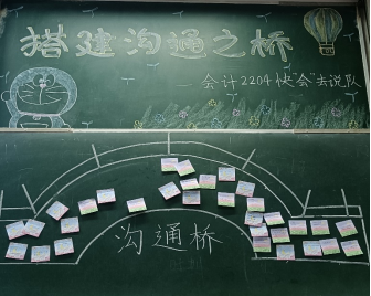 最后,为了加深同学们在本次班会中所学知识的理解与掌握,主持人通过有奖问答的形式,抽取了六位同学分享补充自己对于达成有效沟通的方式技巧。随后,工作人员给每位同学发一张便利贴,主持人组织大家将自己的收获理解写在便利贴上,并将其贴到黑板上的沟通之桥框架内,以此搭建属于本班的沟通之桥。