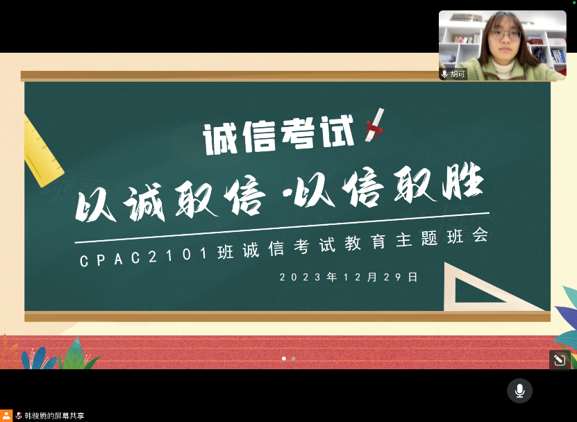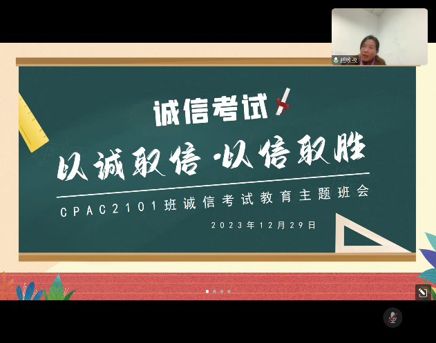 新闻网讯(学生通讯员:韩骏腾)为明确“无人监考”考场纪律,培养学生诚信意识,加强考风考纪宣传教育,营造积极向上的考试氛围, 12月28日下午,英国上市公司官网365CPAC2101班于腾讯会议线上召开诚信考试教育主题班会,班级导师温倩老师、辅导员胡牧孜老师出席本次会议。