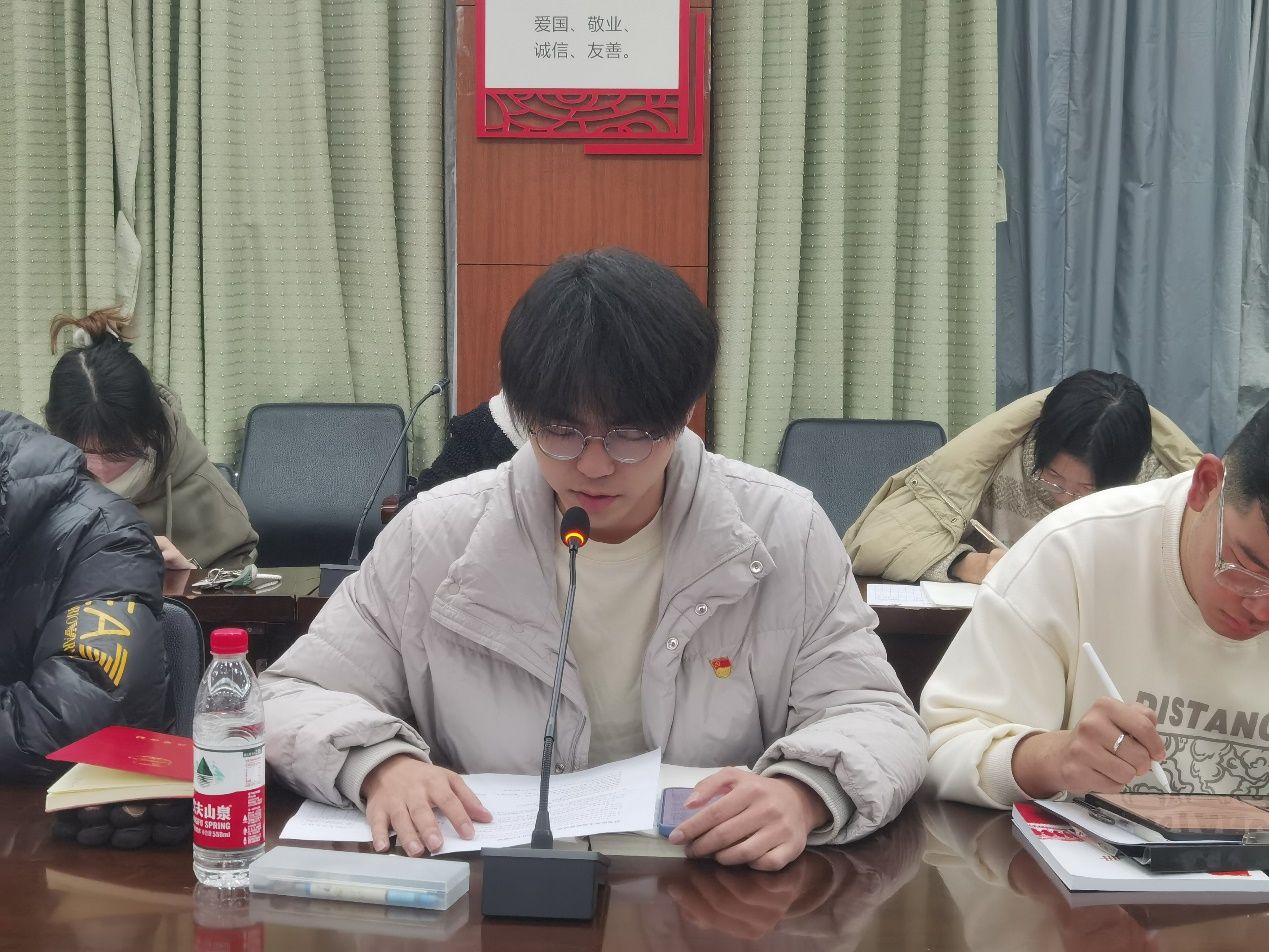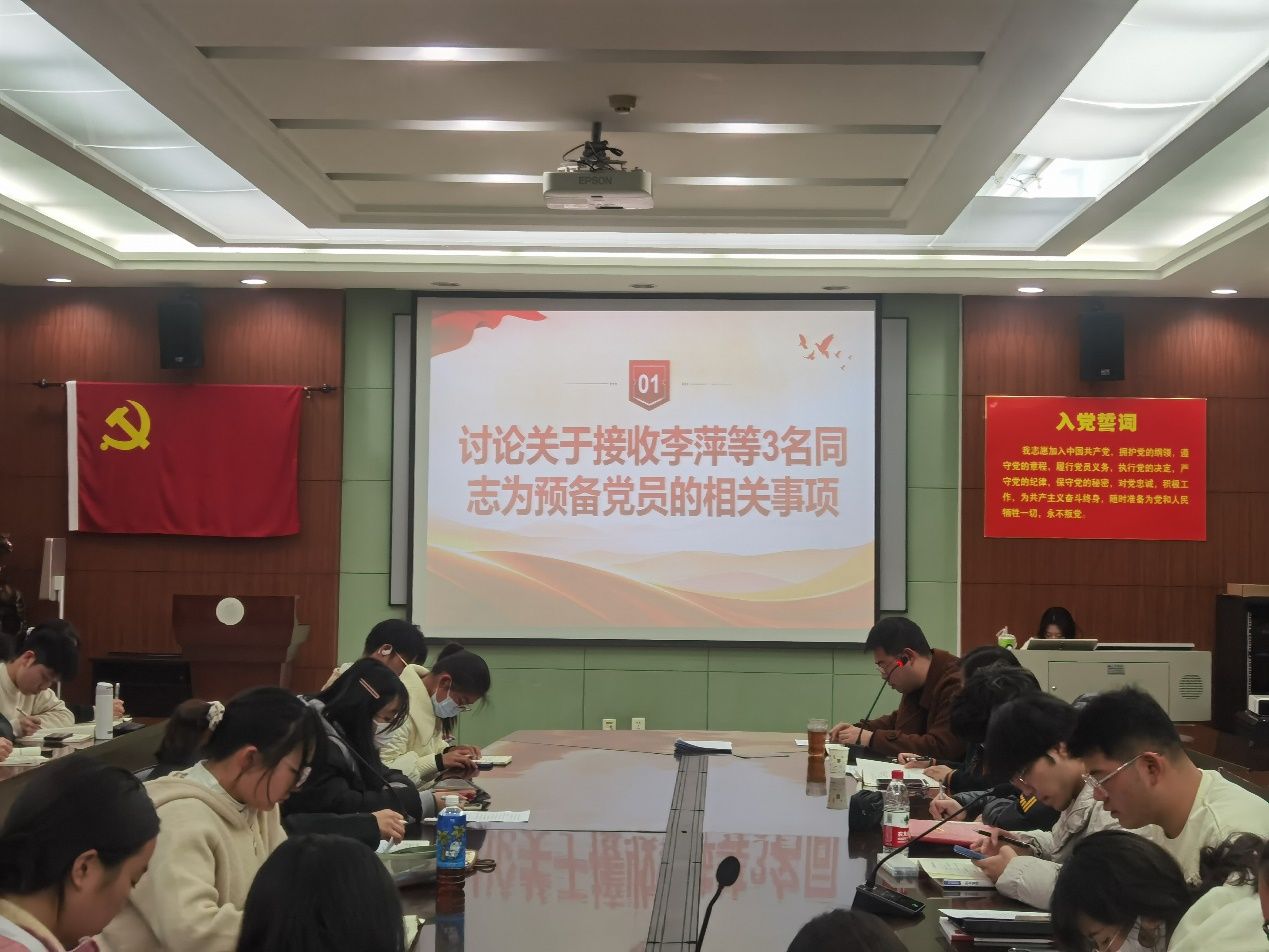 组织生活会结束后,党支部召开了支部大会,本次支部大会讨论了关于接收李萍等3名同志为预备党员的相关事项和关于滕阅同志转正的相关事项,李萍等3名发展对象逐一汇报自身对党的认识、入党动机、本人履历、家庭和主要社会关系情况,并深刻剖析自身存在的不足,以及其他需要向党组织说明的问题。胡牧孜老师作为入党介绍人简要介绍了发展对象的主要情况并对其能否入党表明意见,代表支委会向大会报告对发展对象的政治审核情况、征求党员和群众意见等情况。范纯琍老师作为入党介绍人对滕阅同志在预备期内的表现进行了介绍,并宣读了支委会审查意见。大会以不记名投票的方式进行表决,关于接收李萍等3名发展对象为中共预备党员和关于滕阅同志转正决议均顺利通过。