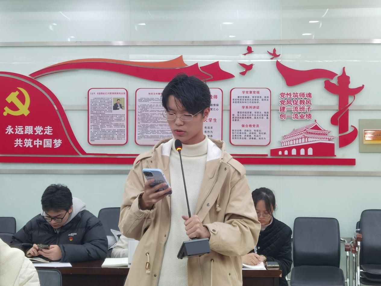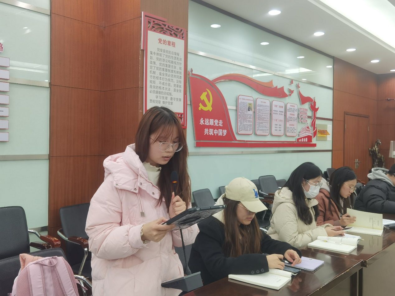 活动开始,党支部进行规定动作,现场交纳党费,重温入党誓词,坚定理想信念,勇毅前行。在领学环节中,钞宇轩同志带领大家学习《中央经济工作会议在北京举行 习近平发表重要讲话》。习近平总书记在讲话中全面总结2023年经济工作,深刻分析当前经济形式系统部署2024年经济工作。对我国经济的发展方向进行深入分析,对未来的发展道路指明方向;王宁馨同志带领大家学习《习近平:加强涉外法制建设 营造有利法制条件和外部环境》,强调加强我国涉外法制建设的重要性,健全我国法律体系,推动我国更高水平对外开放,更好应对外部风险挑战,为中国式现代化行稳致远营造有利法制条件和外部条件。