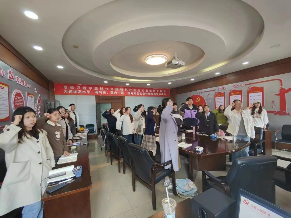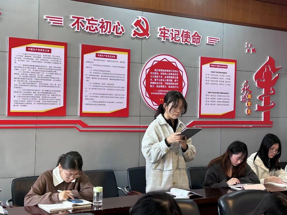 会议开始,党支部全体成员现场交纳党费,重温入党誓词,不忘入党初心、始终保持勇毅奋进的使命担当。韩骏腾同志诵读《中国共产党章程》第五章《党的基层组织》第三十—三十二条 。