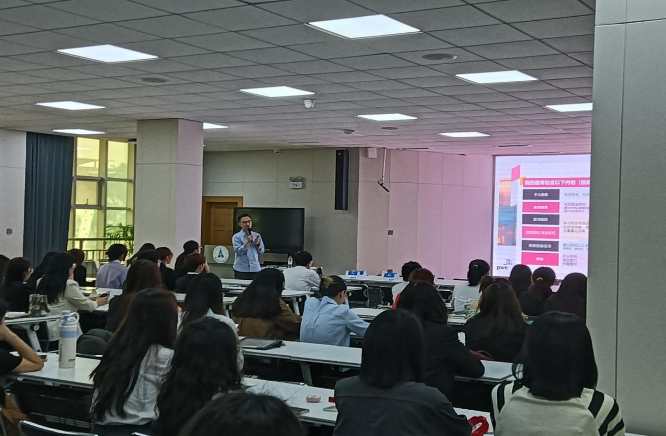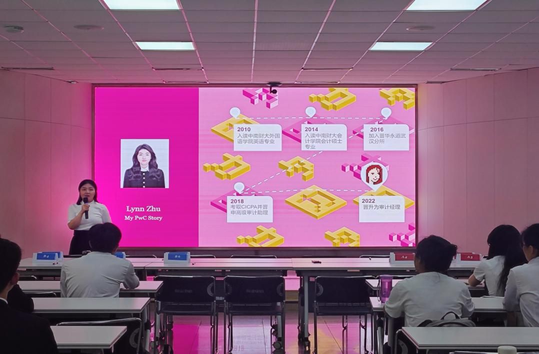 随后,由校友Lynn Zhu从2010年进入我校学习,到2016年从会硕中心毕业,再到如今成为武汉分所审计与鉴证服务部经理的经历。期间,她结合自身经历介绍了校内学习建议,详细介绍在普华永道审计职能,并强调了校招和实习申请的各个时间节点与注意事项。