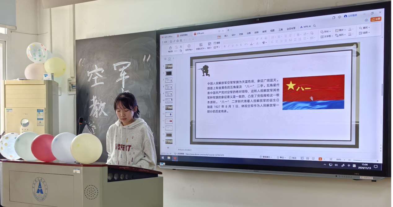 正值第75个空军建军节,会计(卓越)2401团支部于11月13日开展了一场别开生面的空军知识学习团日活动。团支书何怡向同学们详细介绍了空军相关知识,并播放了相关宣传片。“天空之上,写满荣誉。”此次空军知识学习不仅让同学们对空军有了更加直观的认识,也使同学们意识到了作为新时代青年的责任与使命。